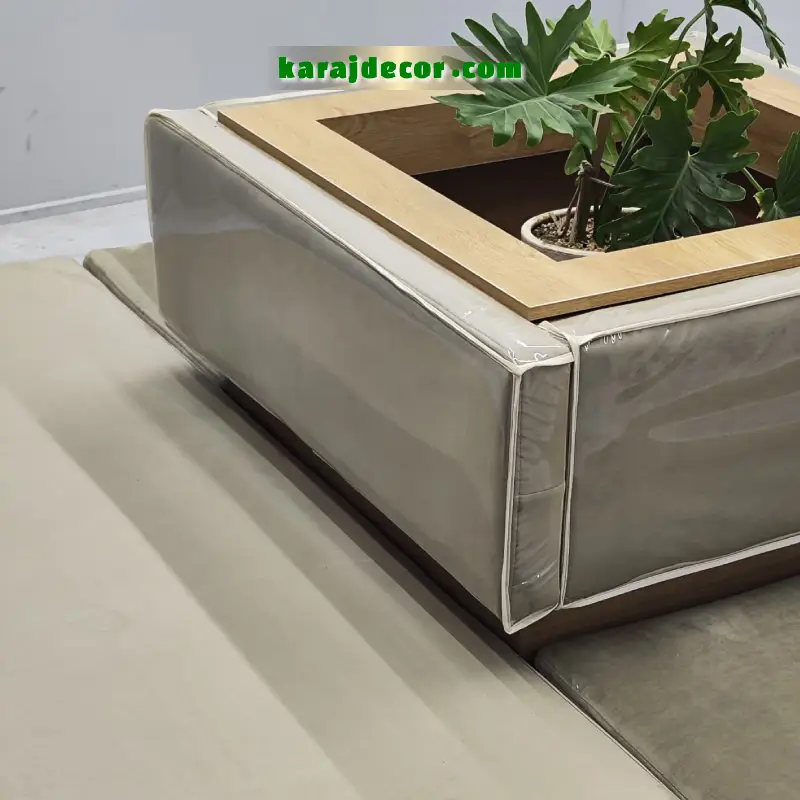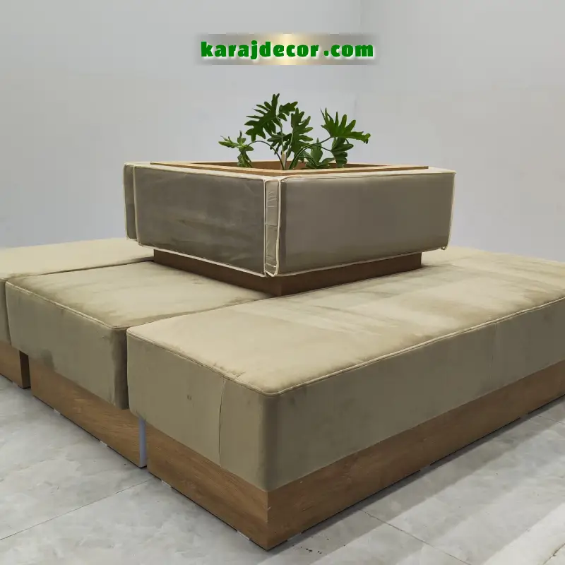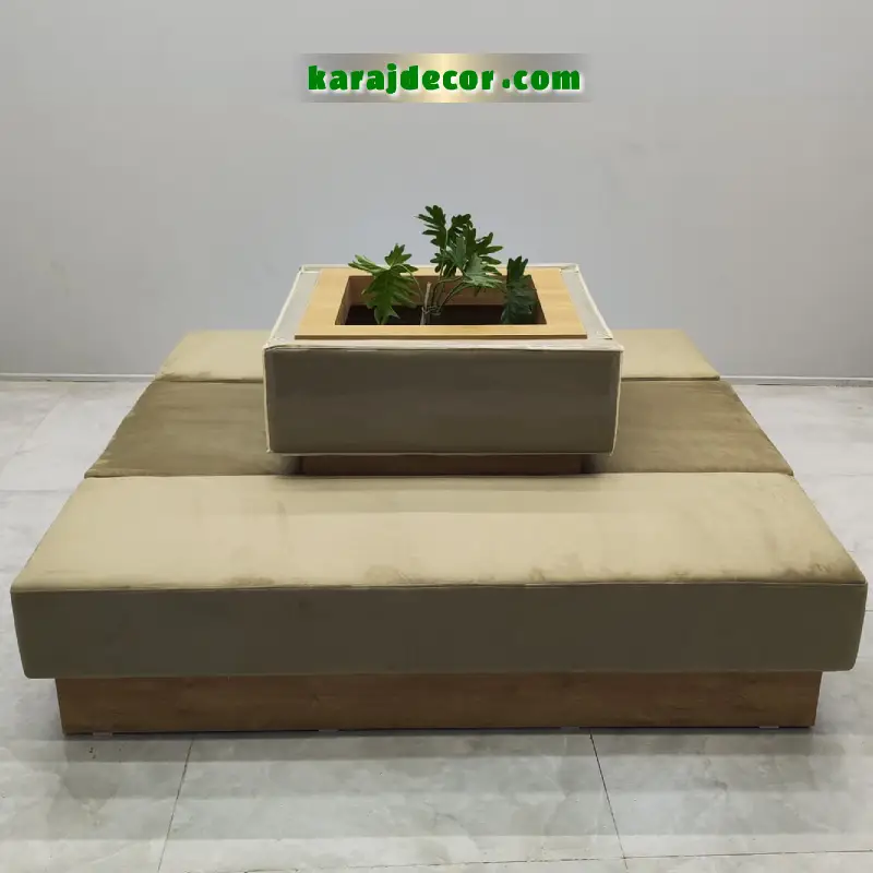 طراحی این مبل آرایشگاه لاکچری به صورت ماژولار انجام شده و امکان چیدمان انعطاف پذیر را فراهم می کند. وجود باکس مرکزی تزئینی (قابل استفاده به عنوان گلدان یا المان دکوراتیو) باعث شده این مدل علاوه بر کاربردی بودن، نقش مهمی در زیبا سازی فضای سالن ایفا کند.